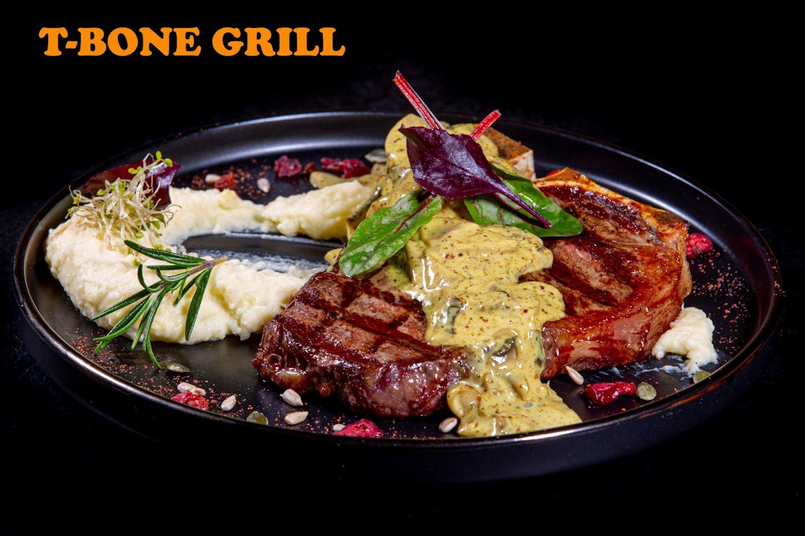 chiflă, carne de vită, cartofi prăjiți, salate la alegere, sosuri la alegere 400g -